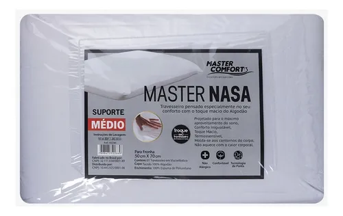 O Travesseiro Master Nasa foi desenvolvido com tecnologia de ponta para garantir noites de sono mais saudáveis e revigorantes. Seu enchimento em espuma de poliuretano viscoelástica (NASA) é termossensível, adaptando-se perfeitamente aos contornos do corpo sem reter calor, proporcionando suporte médio e conforto personalizado.